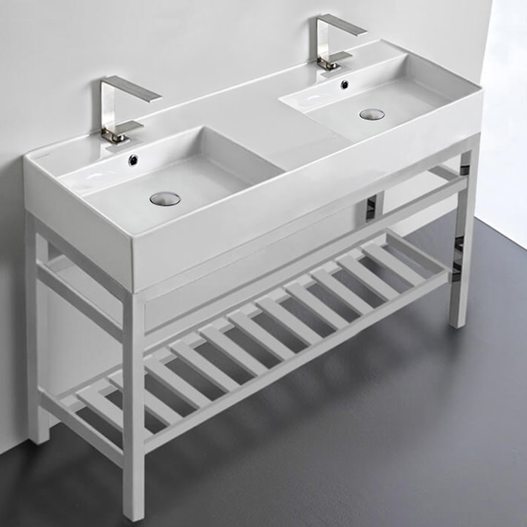 | Short Description: | Modern style white ceramic bathroom sink and polished chrome stand. Stand is made of high-quality stainless steel in a polished chrome finish and a lower towel rack with more usable space. Double bathroom sink has faucet hole configurations of two hole and six hole and includes an overflow. Made in Italy by Scarabeo. |