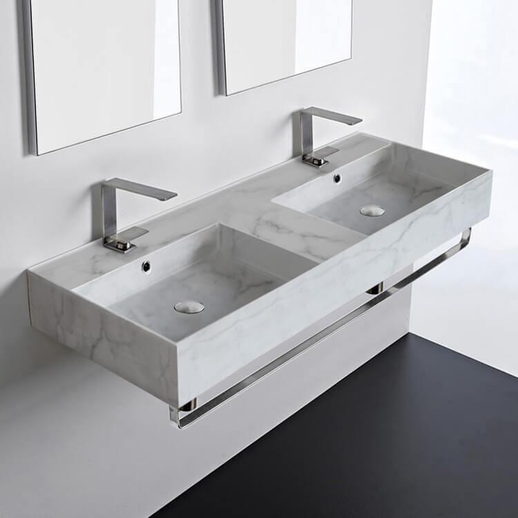 | Product Name: | Marble Design Ceramic Wall Mounted Double Sink With Polished Chrome Towel Holder |