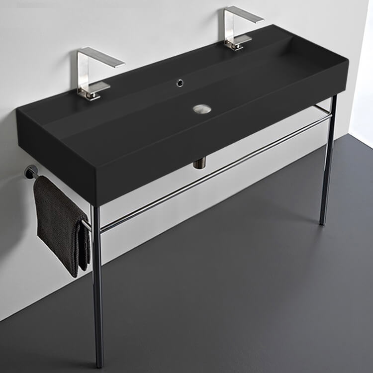 | Short Description: | Modern style matte black ceramic bathroom sink and polished chrome stand. Stand is made of high-quality brass in a polished chrome finish. Bathroom sink is available in two holes or six faucet hole option and includes an overflow. Made in Italy by Scarabeo. |